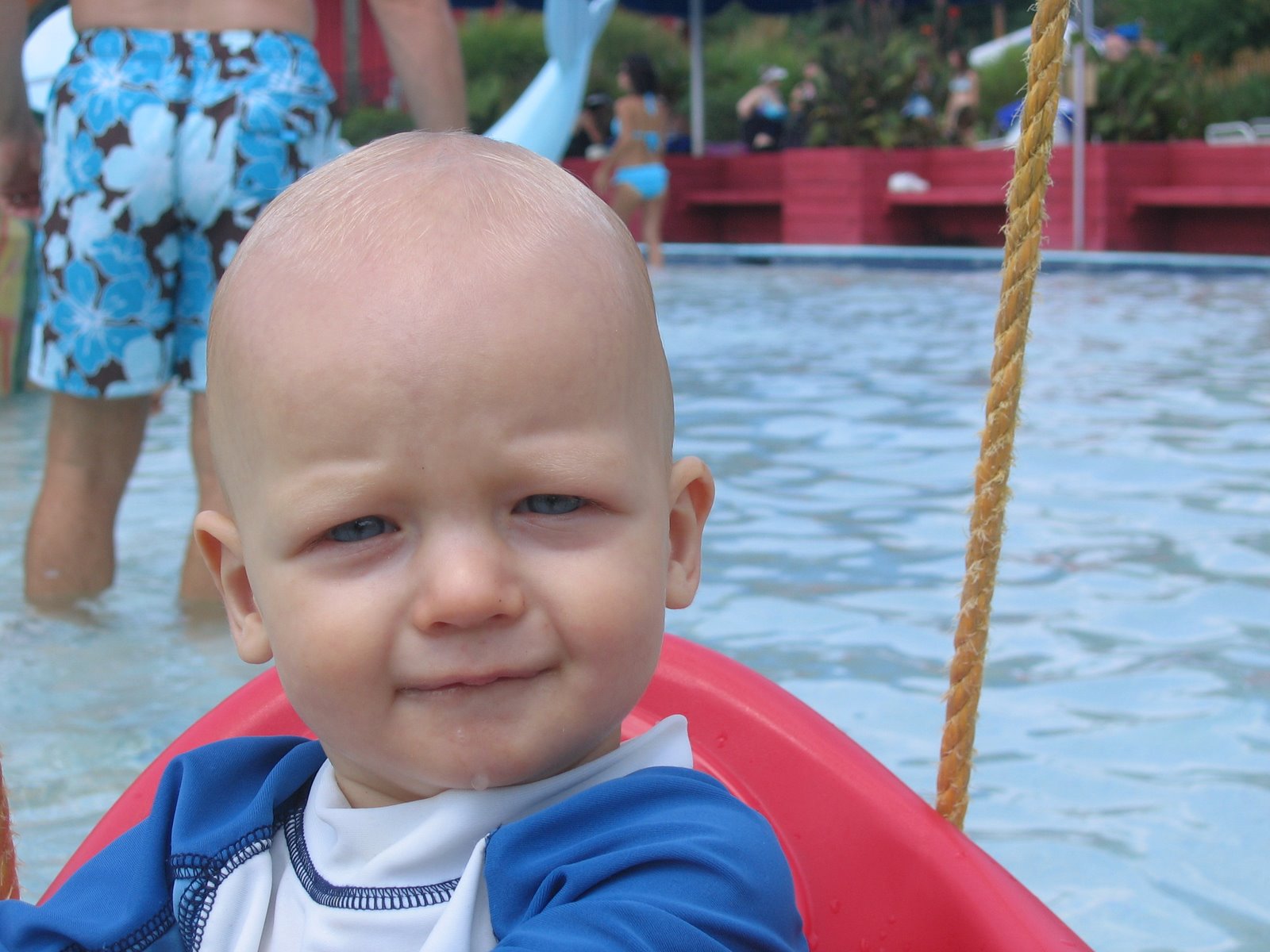 We didn't do much today. I had lunch with Mommy, Daddy, and Aunt Christy. But, the weekend before last, I had a big Wolfpack party for my birthday. Lots and lots of people came to see me. We all ate together, and I got to open presents. I got lots of neat toys and cool clothes. I even got a card that sings! I love to open it up and dance to the music (Dad: over and over and over again). The best part though was when I got my own cake. There was a candle, and everyone sang "Happy Birthday" to me. Then I tasted it, and it was GOOD, so I started stuffing it into my mouth. After a while I got full though, so I decided to just smash the rest of the cake into pieces (Dad: and fling them all over the dining room). I had so much fun at my birthday party. It was so good to see everybody.